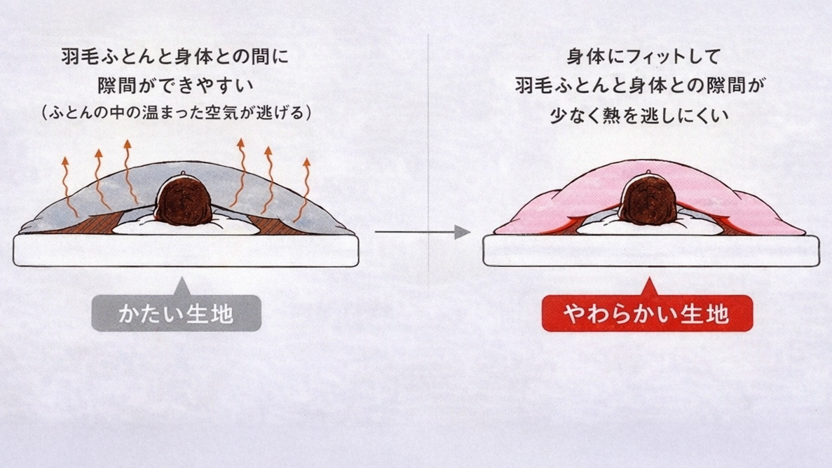 しなやかで柔らかい生地ほど、ドレープ性に富み身体にフィットして隙間を少なくするので、あたたかな空気を逃しにくくなります。