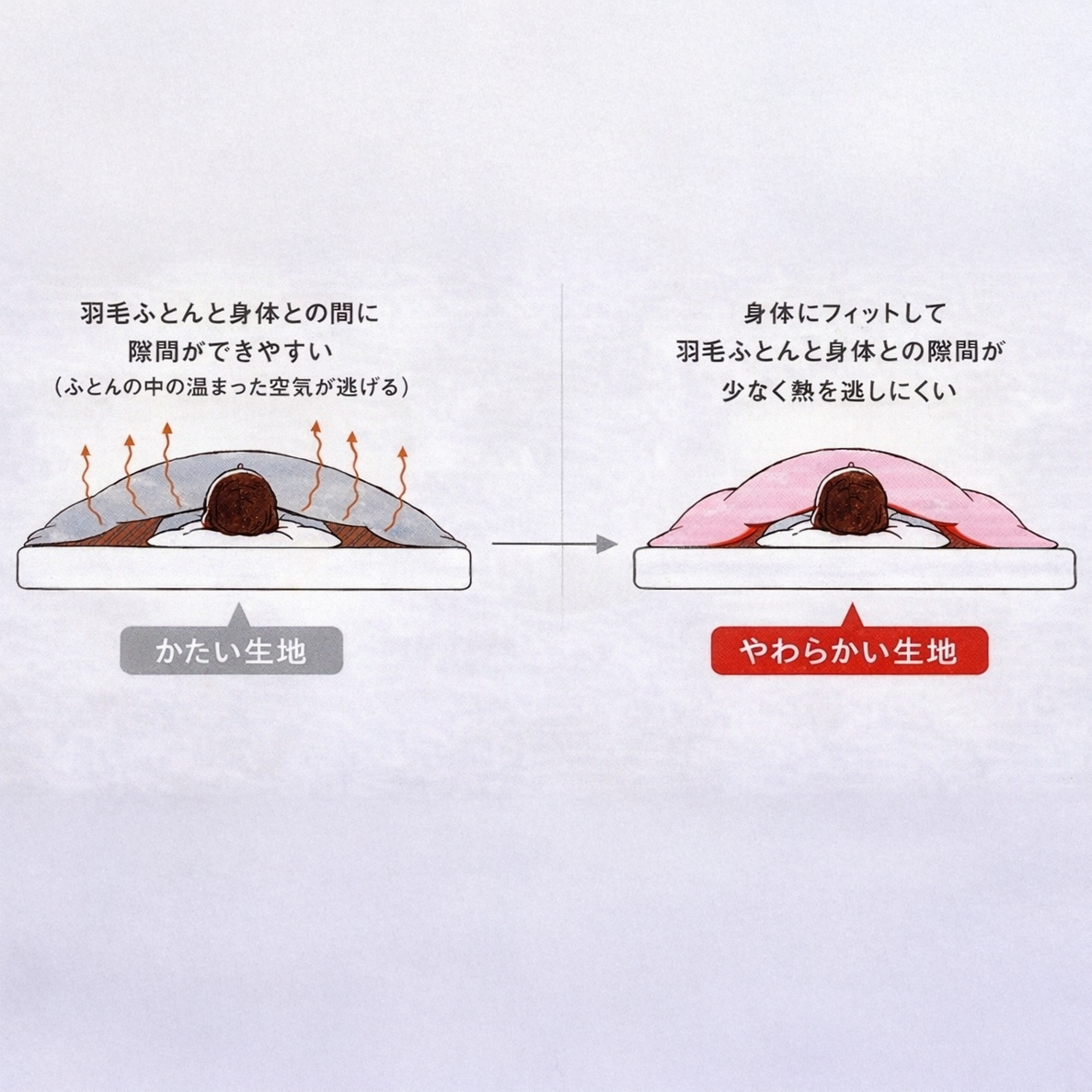 「これまで暖かさを保つために、布団の上に毛布も重ねていましたが、羽毛布団1枚で十分暖かく、毛布が必要なくなったので体に重みを感じことなく、寝返りがうちやすくなりました。」